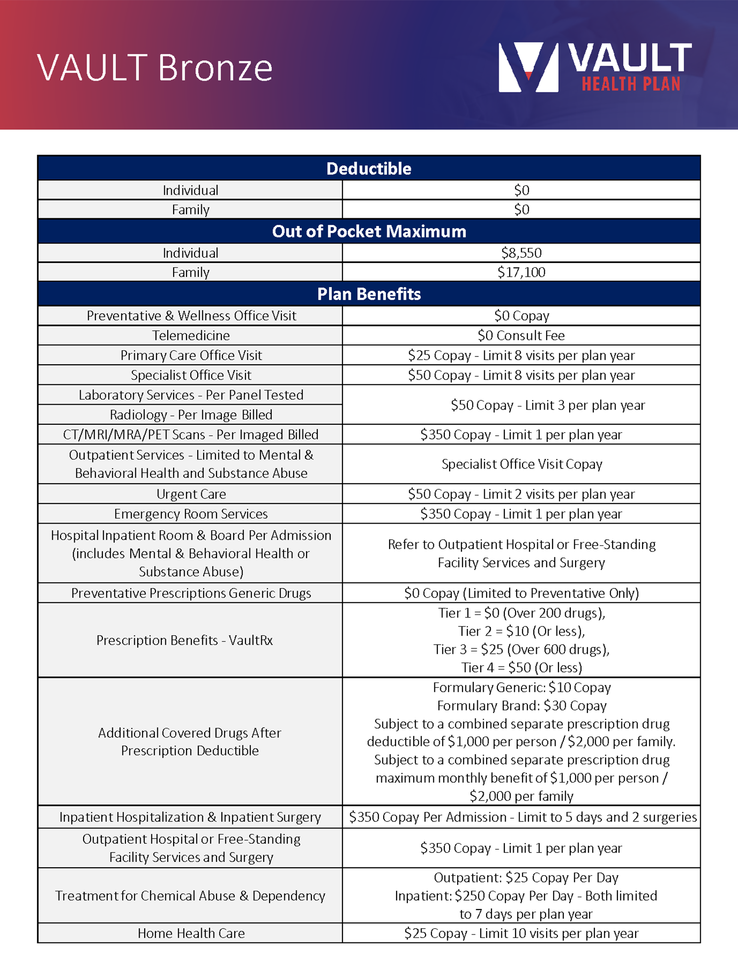 - Labs/Imaging, Hospitalization and Surgery, Preferred Formulary Prescription Coverage, Unlimited $0 Telehealth Consults